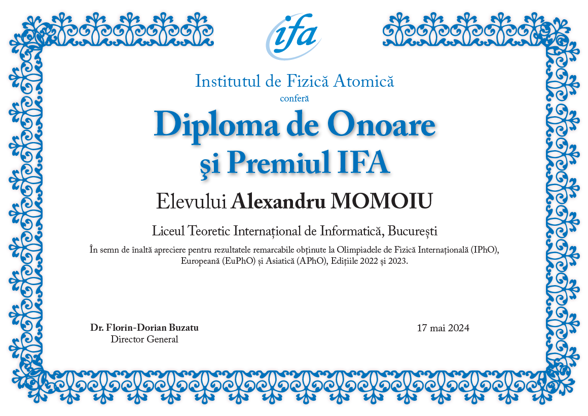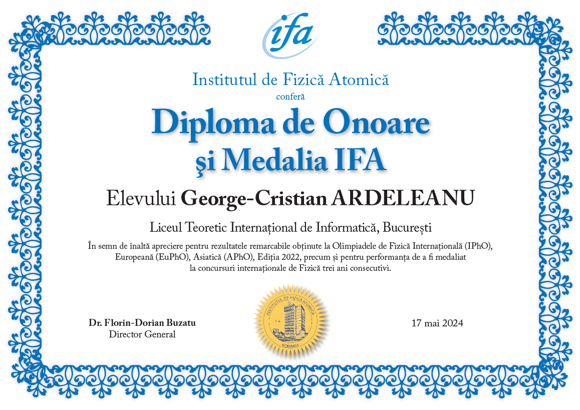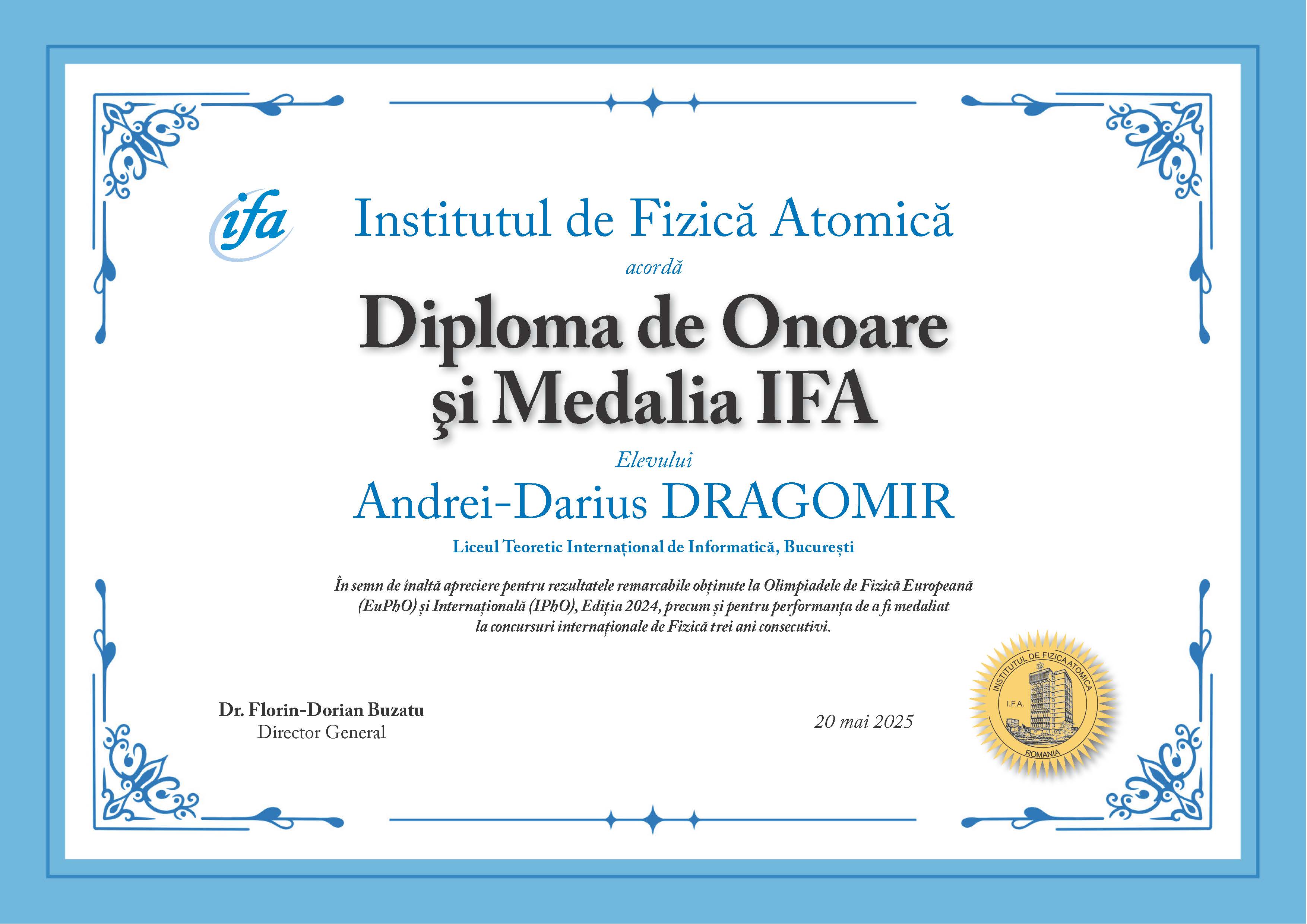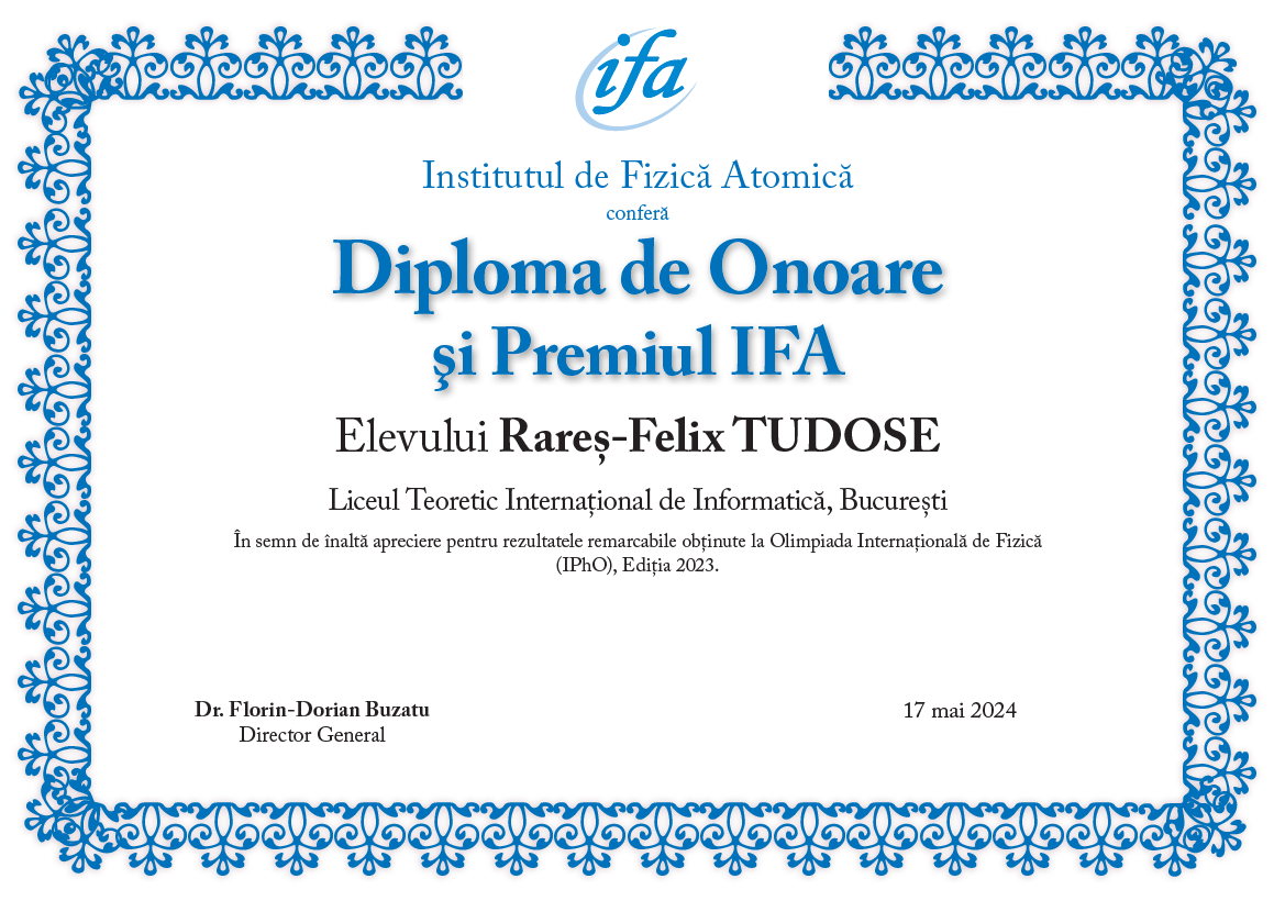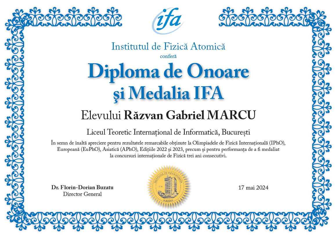 For outstanding results obtained at the International Competition “Romanian Master of Physics”, 2017 As a token of high appreciation of the outstanding results obtained at the International Physics competitions, within the Romanian Olympic Team. |