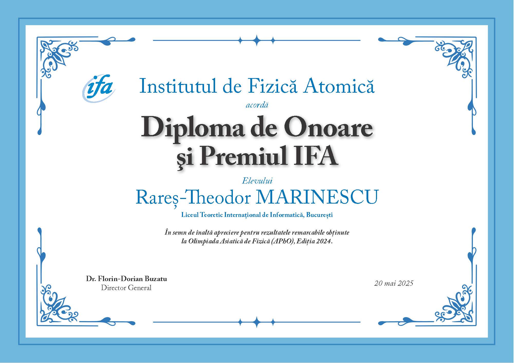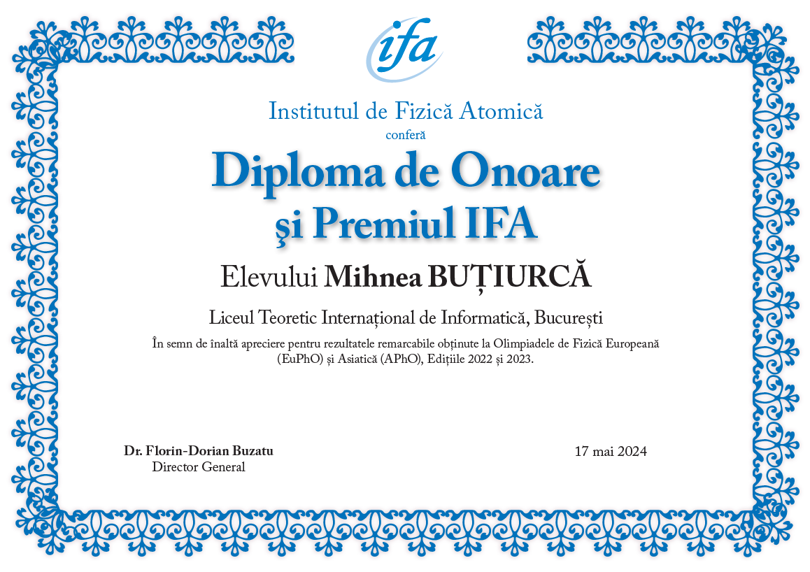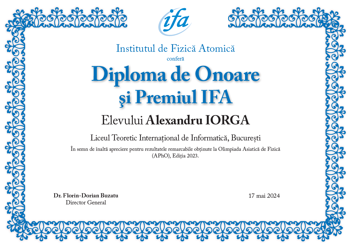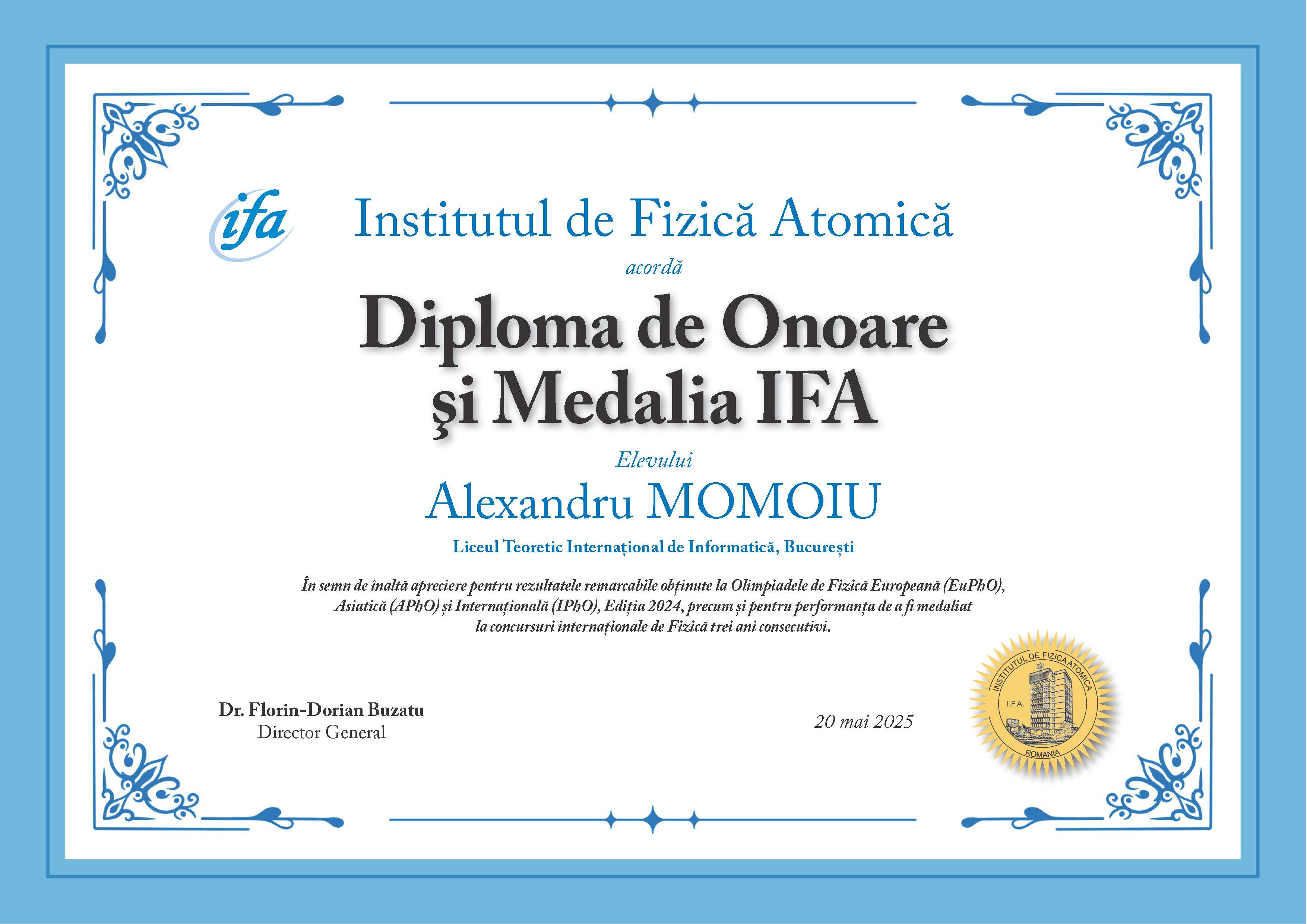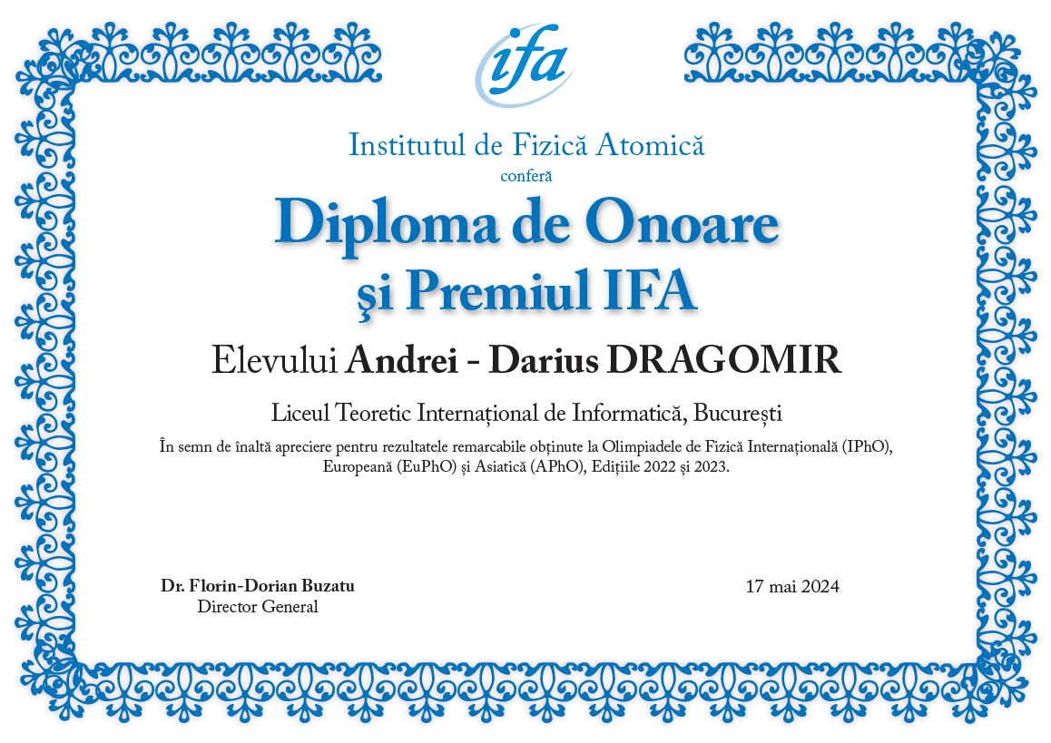 For outstanding results obtained at the International Competition “Romanian Master of Physics”, 2017 As a token of high appreciation of the outstanding results obtained at the International Physics competitions, within the Romanian Olympic Team. |