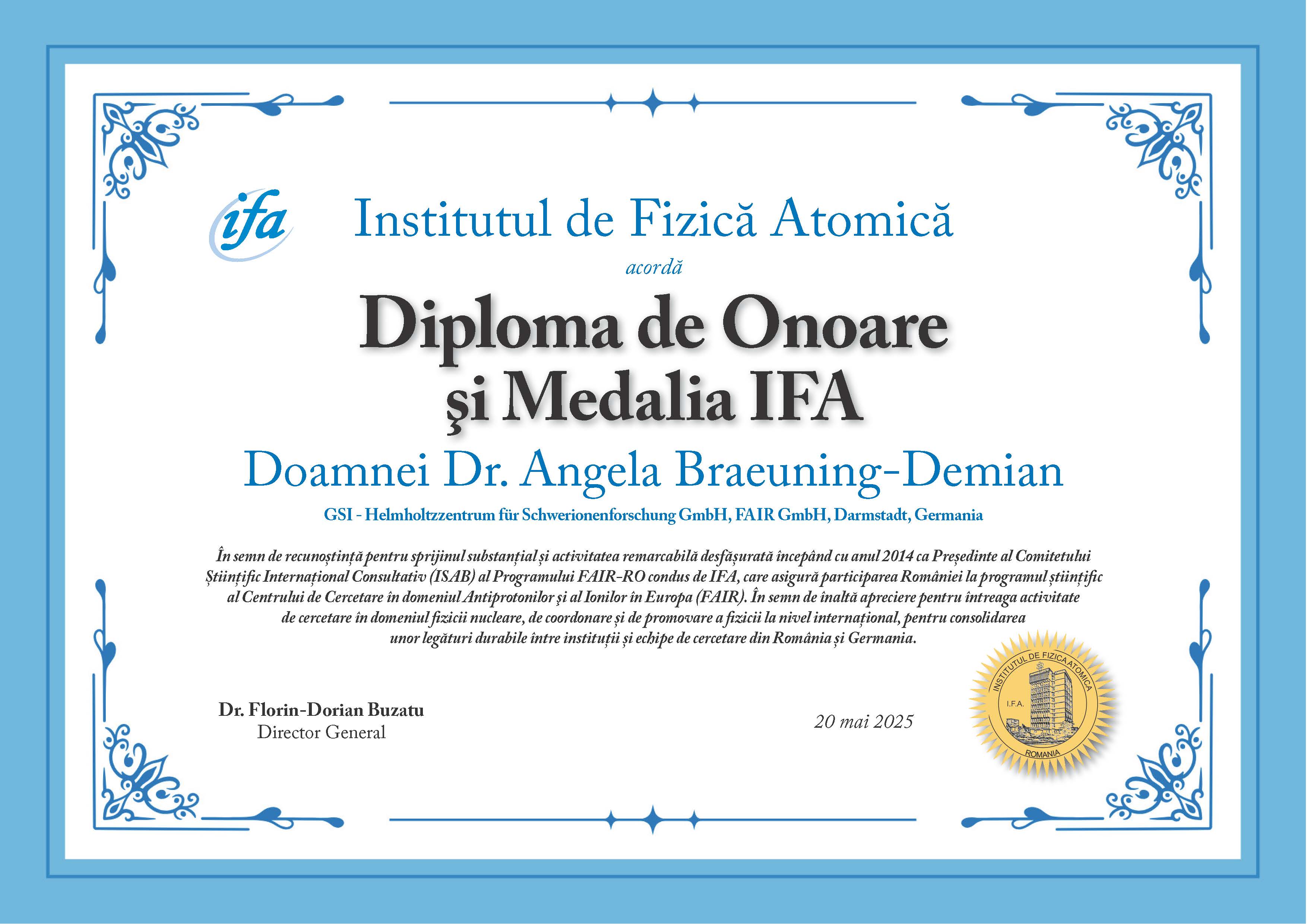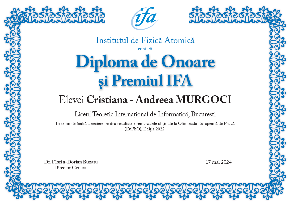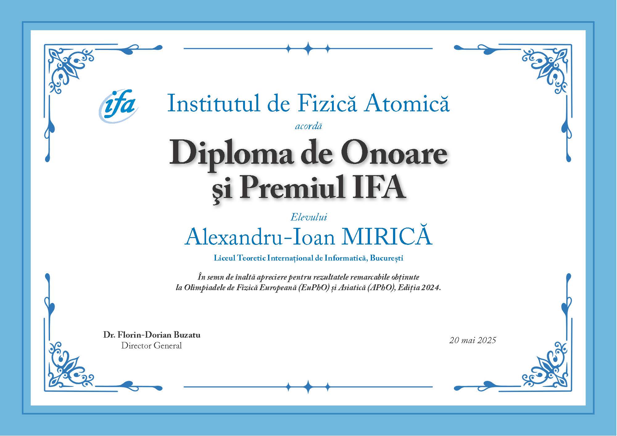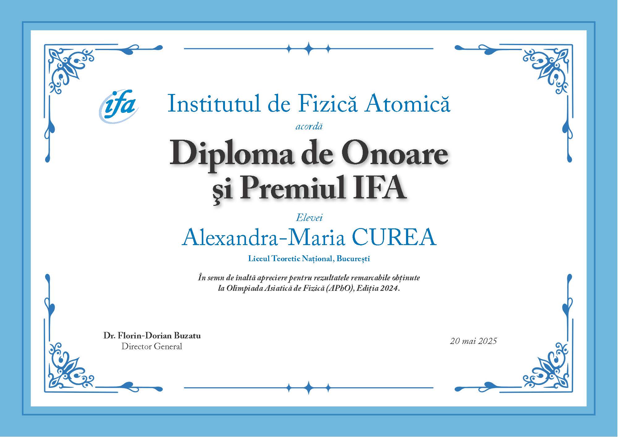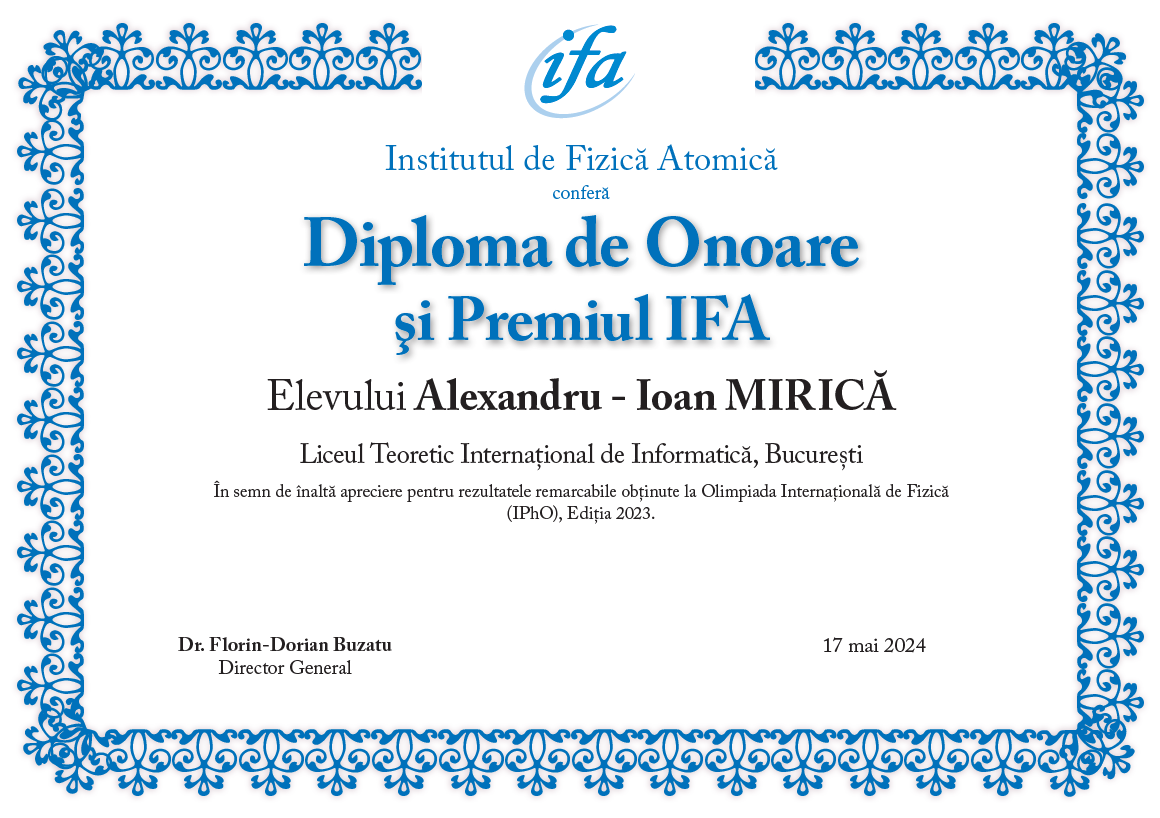 For outstanding results obtained at the International Competition “Romanian Master of Physics”, 2017 As a token of high appreciation of the outstanding results obtained at the International Physics competitions, within the Romanian Olympic Team. |