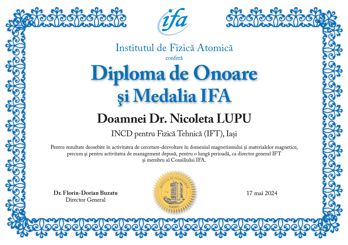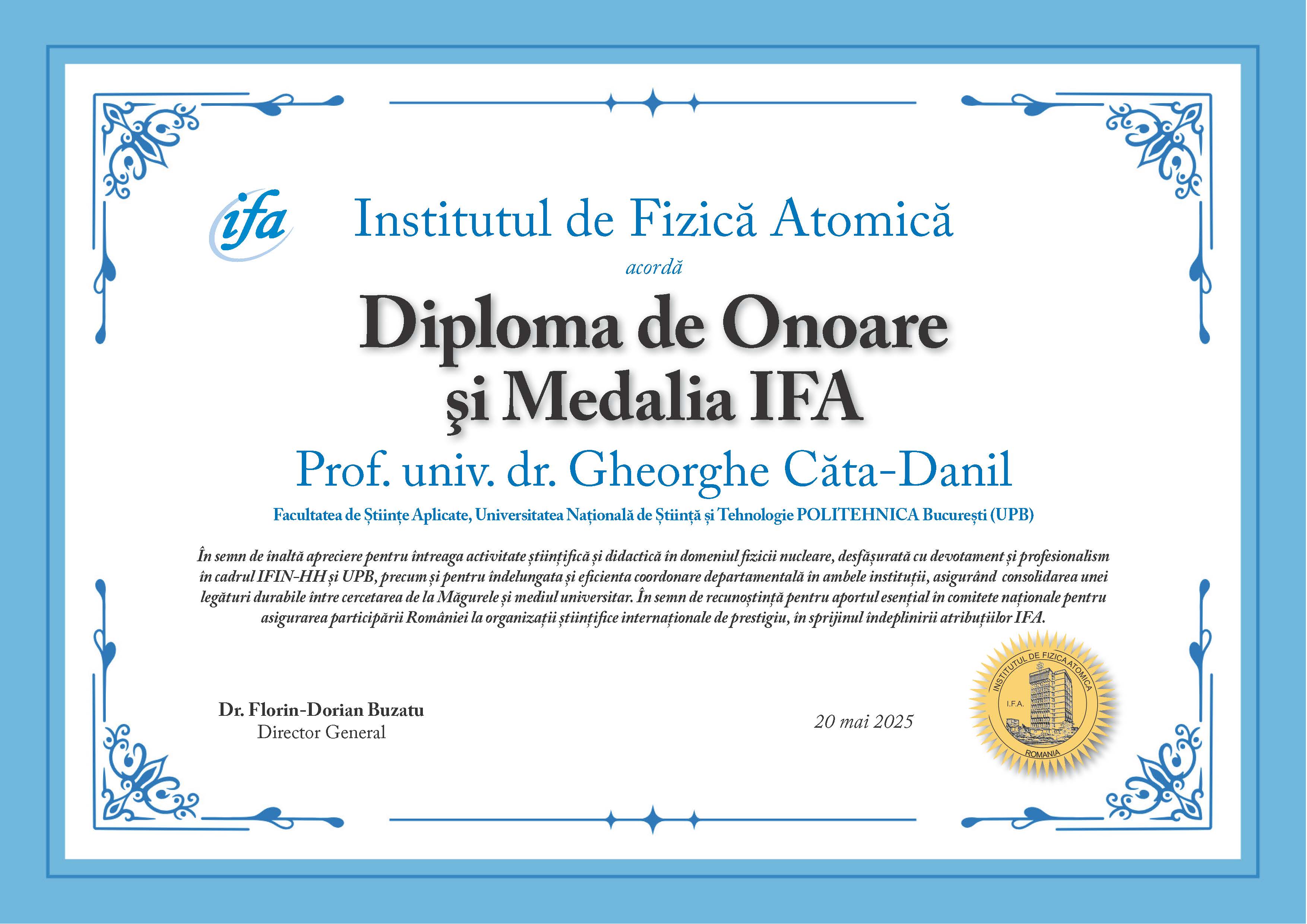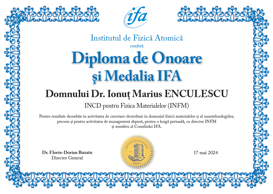 For the entire scientific and managerial activity at "Alexandru Ioan Cuza" University in Iasi and within the Ministry of Education and Research, for the contribution to the development of Plasma Physics in Romania and for the increase of the visibility and the role of Romanian research at international level As a token of high appreciation of the entire scientific and managerial activity as rector of "Alexandru Ioan Cuza" University in Iasi, as State Secretary in the Ministry of Education and Research, as president of ANELIS PLUS, of his contribution to developing the field of plasma physics, to strengthening Romania's participation in EURATOM program. |