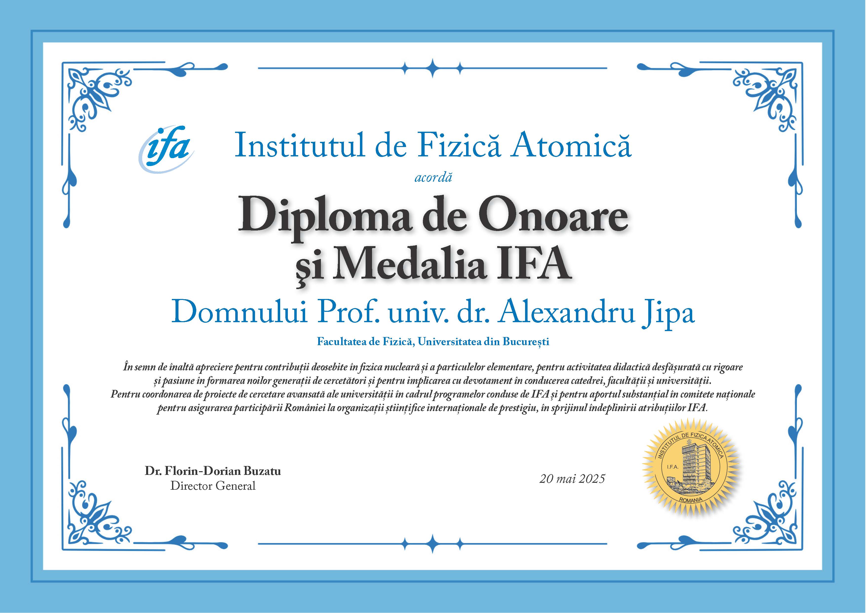 For the entire didactic and scientific activity, for the contribution to the development of Nuclear Physics at national and international level As a token of high appreciation of the entire didactic and scientific activity, of his contribution to the development of the field of high energy cosmic ray and gamma spectrometry. |