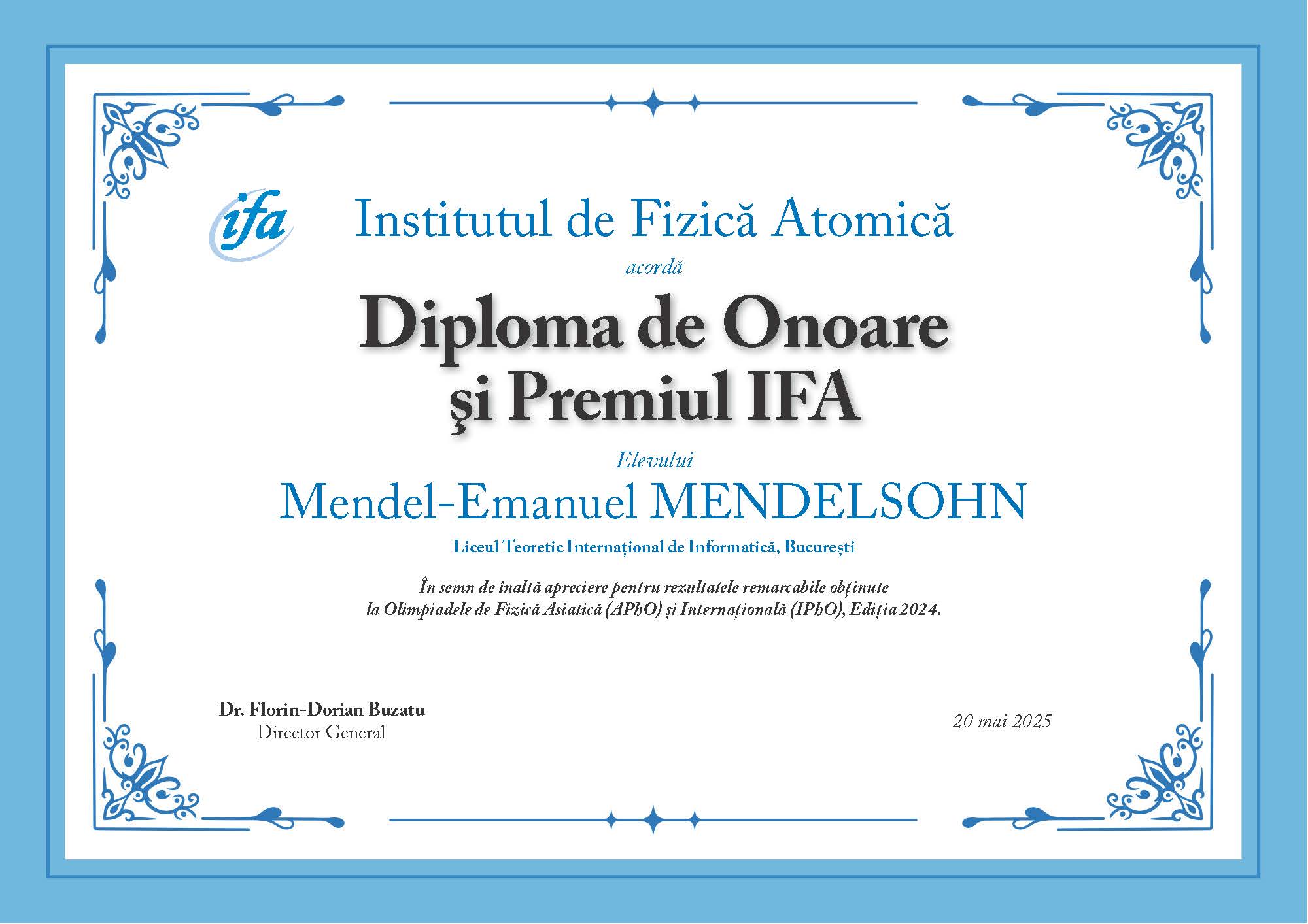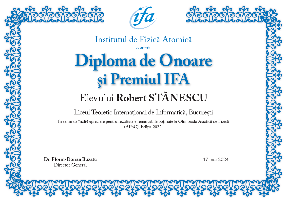 For outstanding results obtained at the International Competition “Romanian Master of Physics”, 2017 As a token of high appreciation of the outstanding results obtained at the International Physics competitions, within the Romanian Olympic Team. |